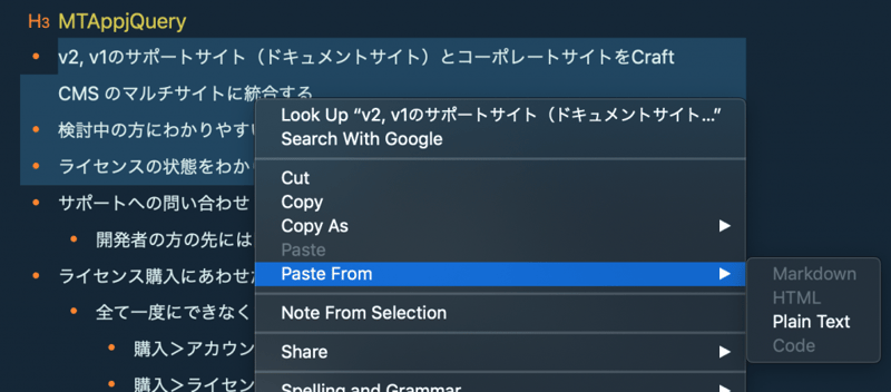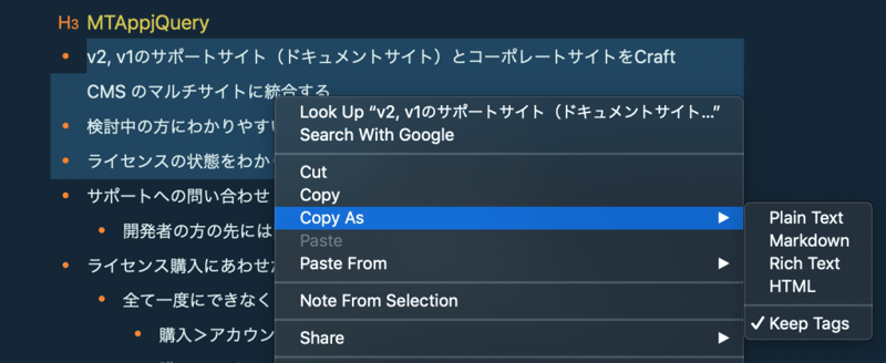 Bear のテキストをコピーするときに Markdown だけかと思ってたら HTMLタグとかでコピーできるのを知った。