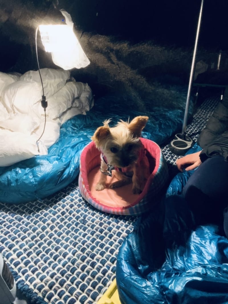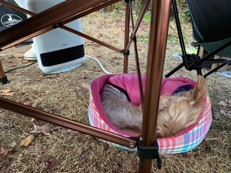 テントの中にはブランケットを一枚敷いてみた。家で敷くとマリーがトイレと勘違いするので最近敷いてなかった。