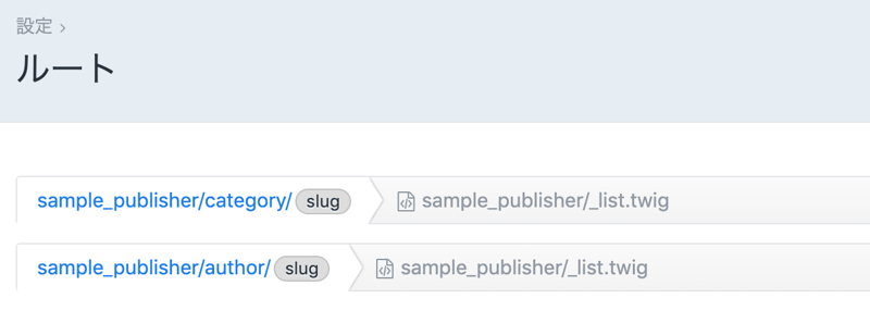 ルートの設定ではこのURLルールのときに処理するテンプレート(sample_publisher/_list.twig)も設定してある。