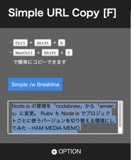 Chromeで使っていたタイトルとURLをコピーする拡張がクローズしてたのか新しい MacBook Pro で使えなくなっていたので、Simple URL Copy [F] を使うことにした。