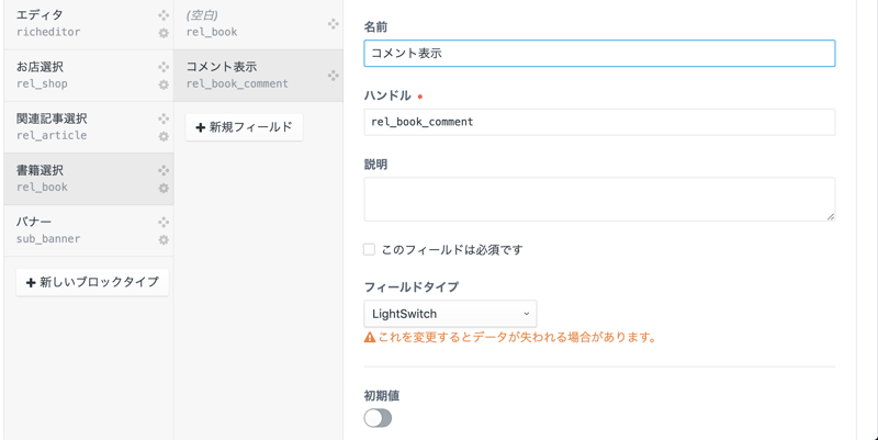 今回新たにセクションを作ってみて、そちらで管理したものを引っ張ってきて使えるようにしてみようとしたときにlightswitch部分をうまく取れなかった。