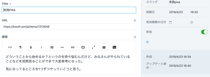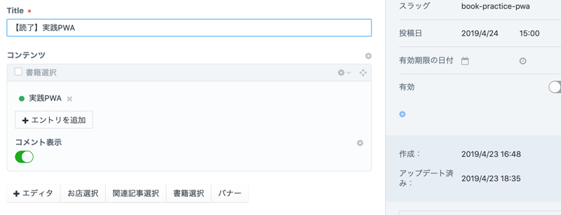 コメント表示をONにしたときはbookセクションの方に書いた感想を表示させる。