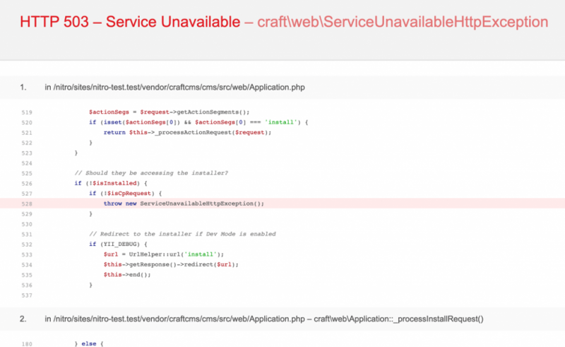 この状態で http://nitro-test.test/ にアクセスすると Craft のインストールがすんでいないので 503 エラーが表示されている状態になる。