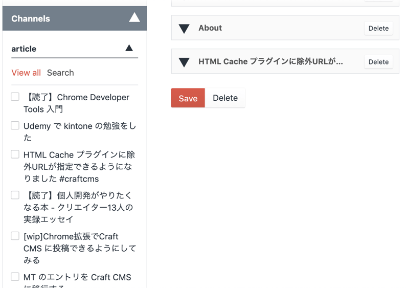 セクションも記事単位で選択できるんだけど、追加ボタンが一番下で、エントリ数が多いとちょっと使いづらい。