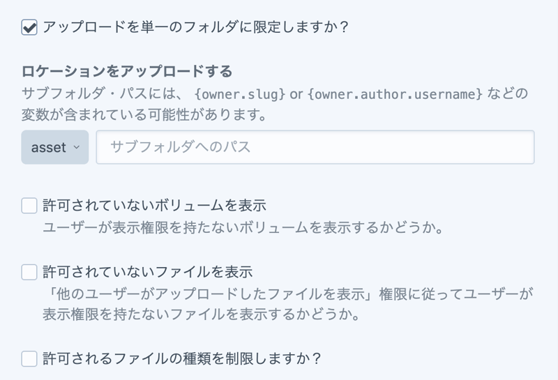 アセットのフィールドの設定にもその辺の他の人のあげた画像を見れるようにするか?などの項目が増えている。