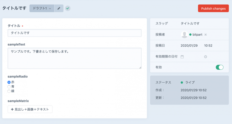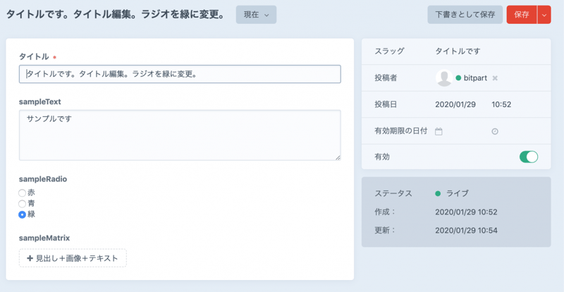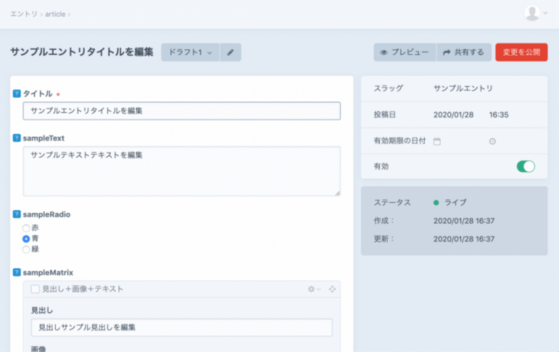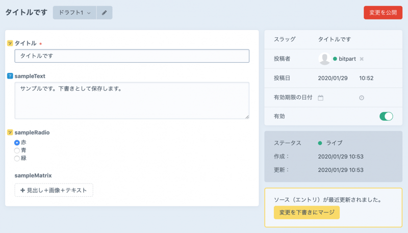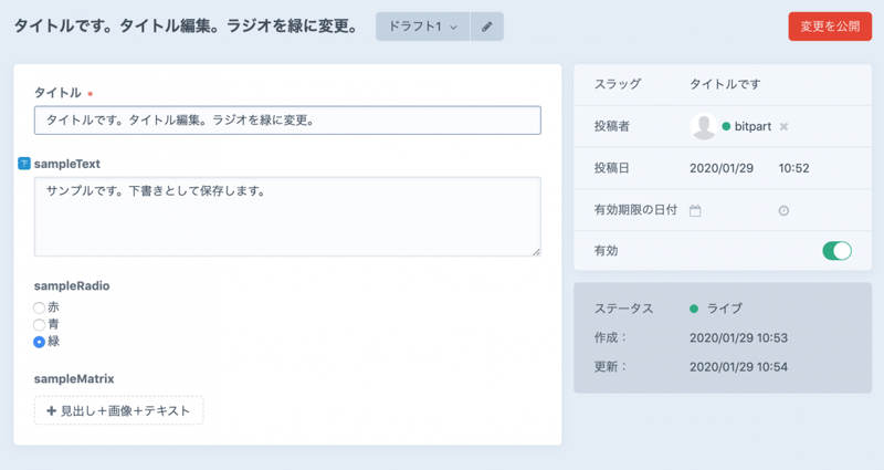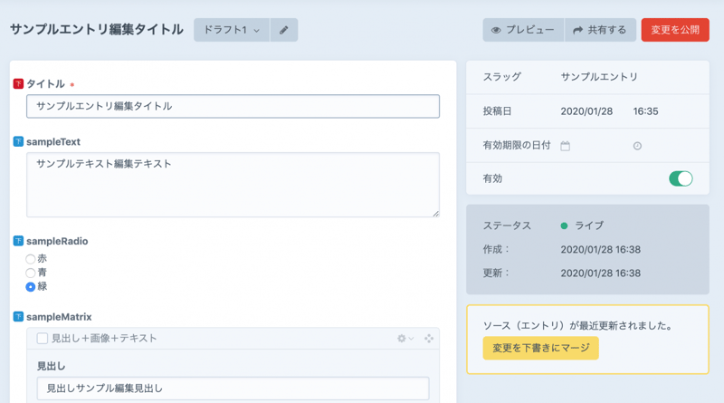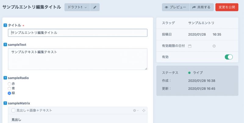 "title": "サンプルエントリ公開済みを変更",