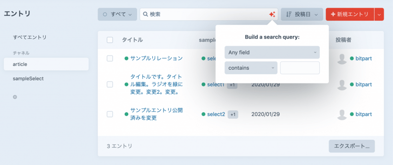 検索の対象はデフォルトフィールドのタイトル、Slug、に加えて入力タイプで設定しているフィールドになる。