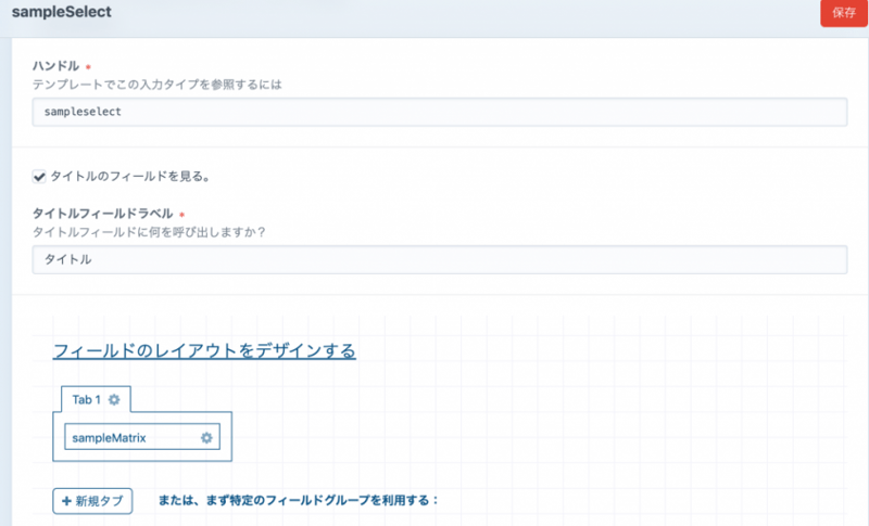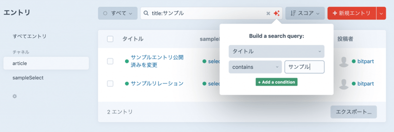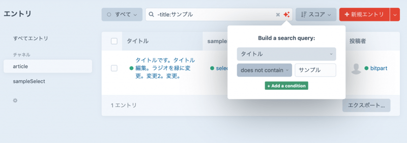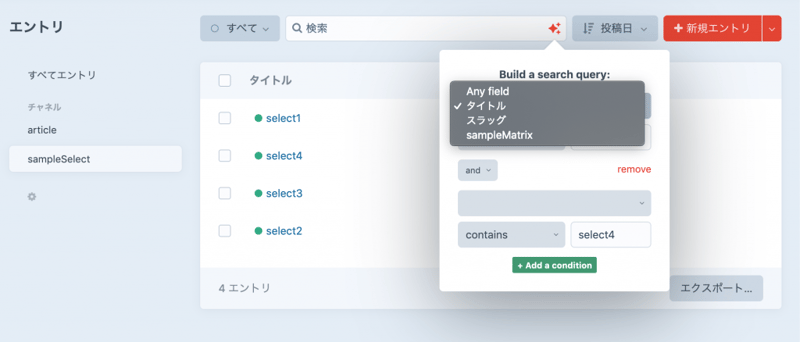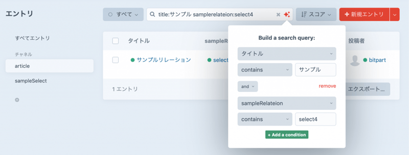 タイトルに「サンプル」を含み、sampleRelationのフィールドで「select4」が選ばれているものを検索する。