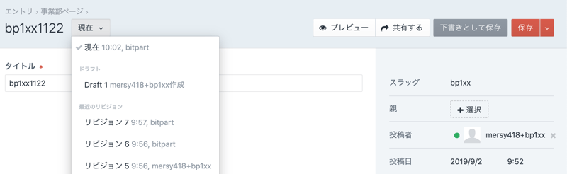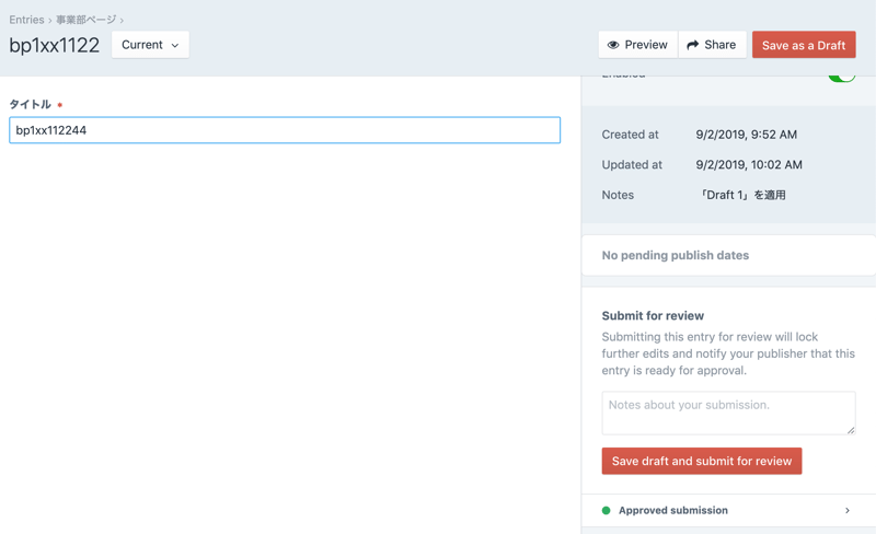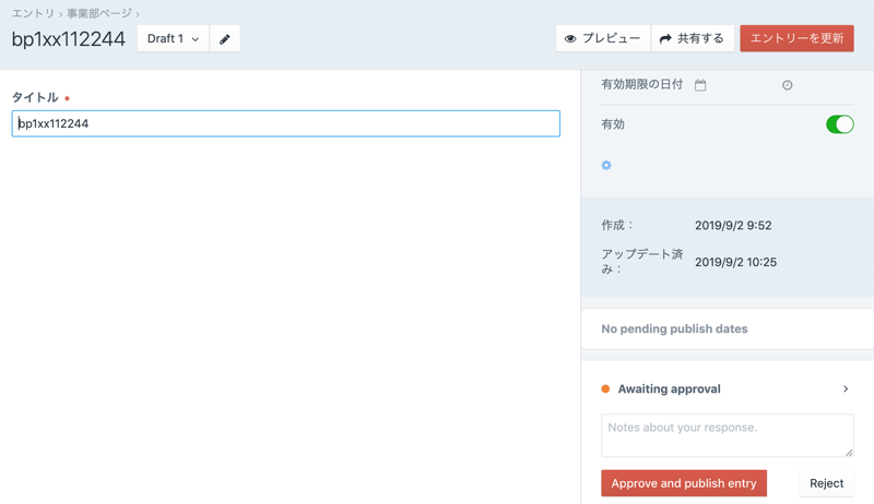 承認できる権限のある人が見ると、通知などを見るか同じエントリを開いてドラフトを見ると、そのドラフトが表示される。