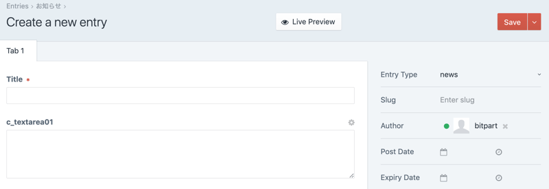 こんな感じで、同じセクションでありながら入力タイプ(Entry Type)を切り替えることで、コンテンツに合わせた柔軟な入力画面が可能になります。