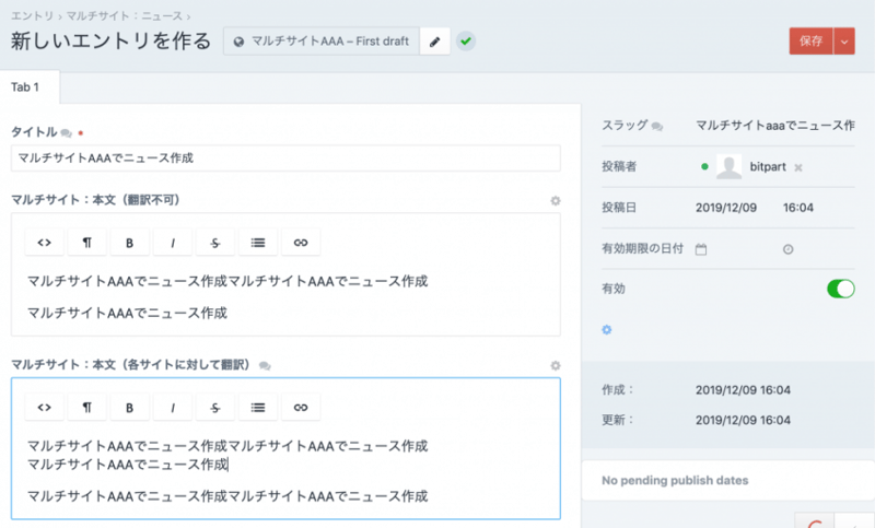 この状態でエントリを「マルチサイト:製品」にサイト「AAA」に作成してみる。
