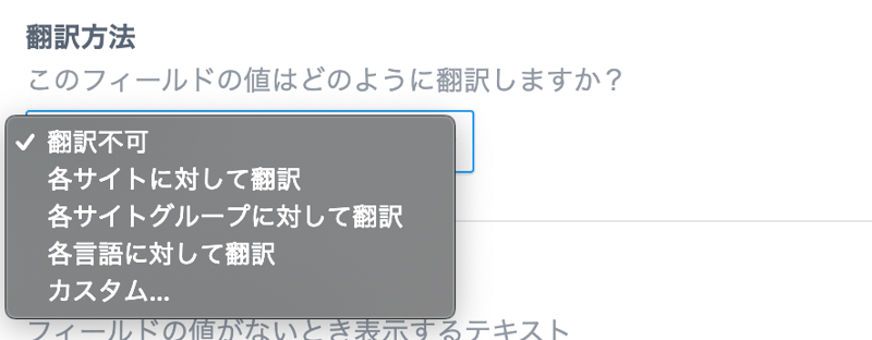 多言語で各言語ごとに翻訳するような場合はフィールドの設定として「各サイトに対して翻訳」「各言語に対して翻訳」を選択すると良いだろう。
