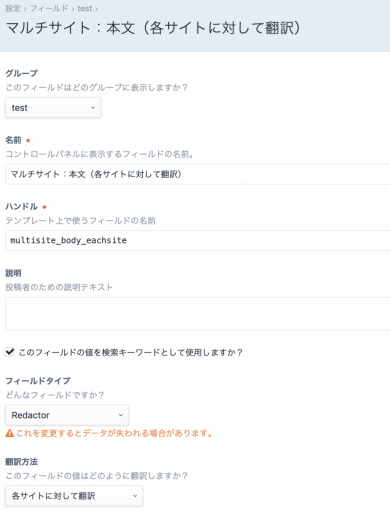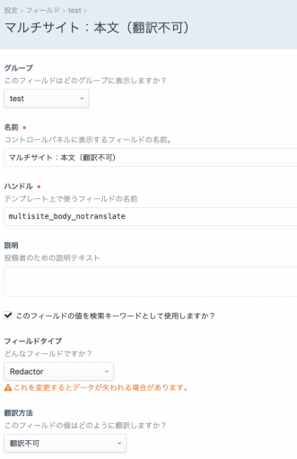 マルチサイトとフィールドの翻訳設定が絡んでくると再利用したりするとわけがわからなくなることもあるので、フィールドを別のセクションでも使ったりする場合は気をつけたほうがよさそう。