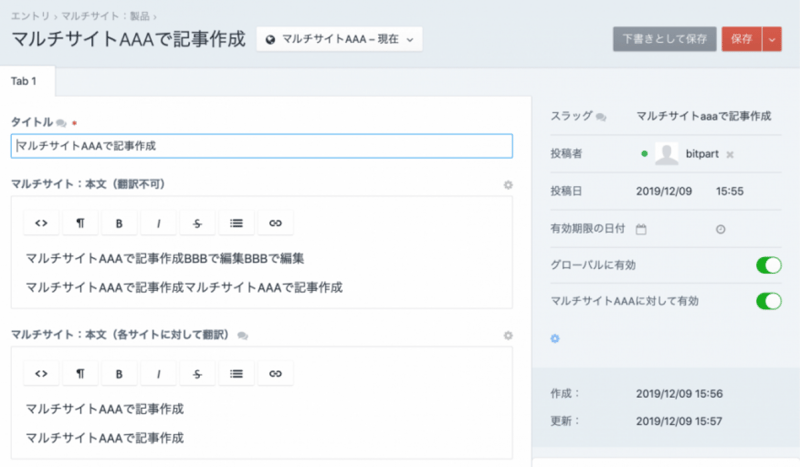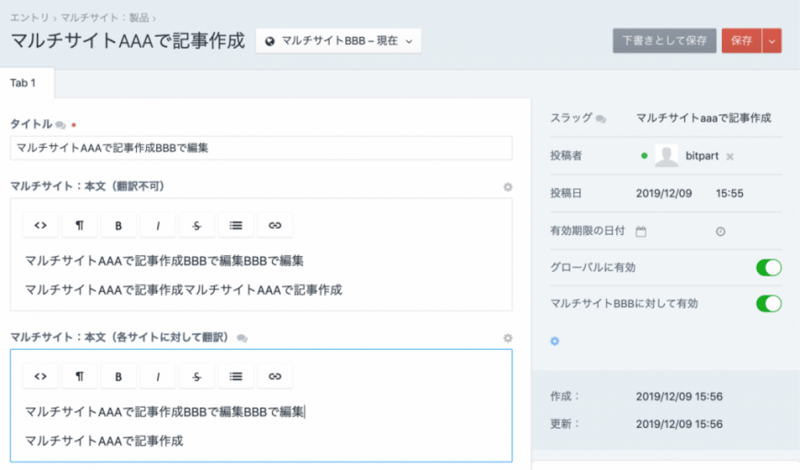 「各サイトに対して翻訳」に指定したフィールドについてはサイト「BBB」で変更した内容はサイト「AAA」には反映されず、「AAA」と「BBB」の内容は別のものとなる。