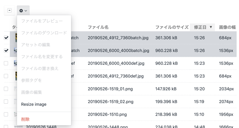 プラグインの機能としてバッチ処理もあるので複数画像の一括リサイズも試してみる。