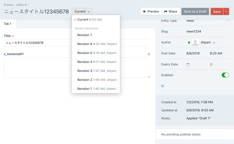 Craft CMS のリビジョン周りの操作をキャプチャとってみた。