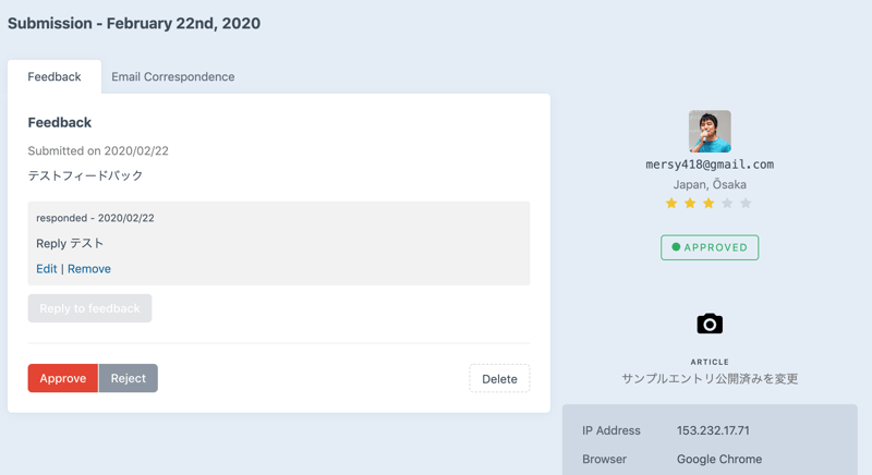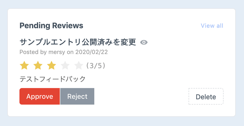 レビューを投稿するとこんな感じで管理画面で確認できる。