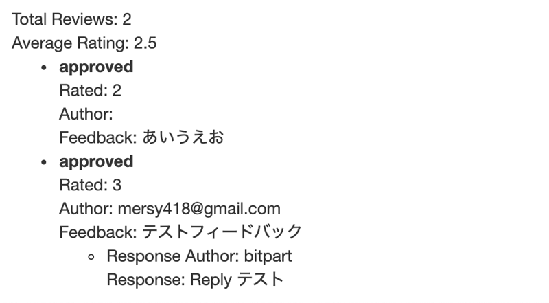 レビューの表示は参考になりそうなテンプレートをコピペしてみたけどなんかエラーになるので dumper で中をみてみて調整した。