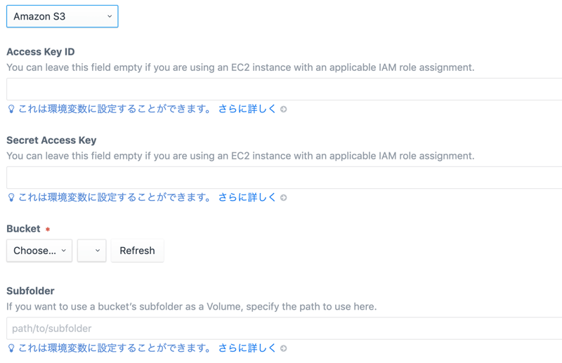インストールするとこんな感じで、アセットのボリュームの設定に S3 が選択できるようになる。