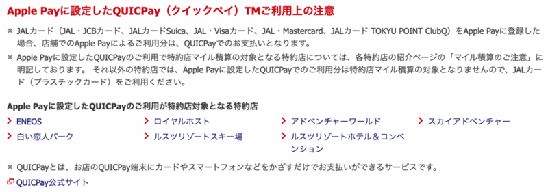 JALカードの特約店ってのがあるけど、Apple Pay(QUICPay)で払う場合はその対象じゃないのね、というのをたまたま知った。