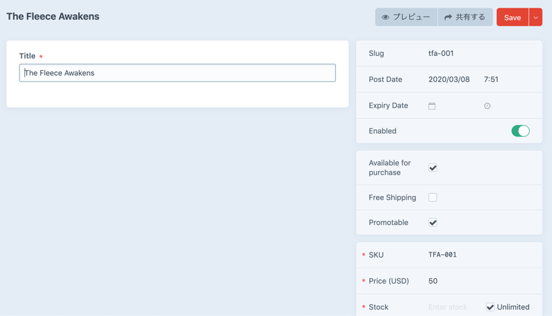 Product の詳細編集画面。