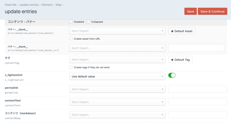 こうすることで対象のエントリが取得できるので Feedme でインポートする設定でインポートの対象は slug を設定しておいて、 lightswitch のところは初期値 ON にしたうえで、初期値を使うでインポートする。