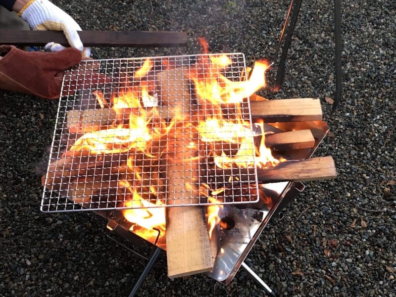 薪で火を付けるとかそもそもよくわからずだけど、色々調べていって割り箸やら牛乳パックとか着火しやすいのを持っていったら意外とすんなりついてよかった。。。